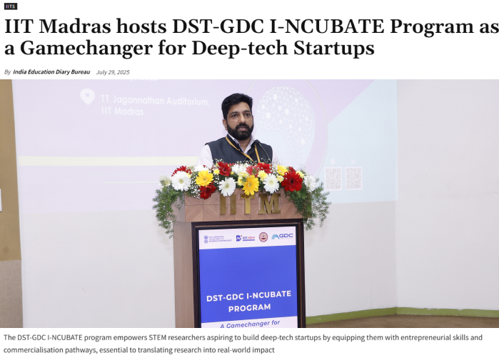 CHENNAI : Indian Institute of Technology Madras (IIT Madras) hosted a seminar on ‘DST-GDC I-NCUBATE Program’ on Monday (28th July 2025), bringing together leaders from government, academia, industry, and the investment community to discuss how India can accelerate the development of deep-tech startups arising from academia.